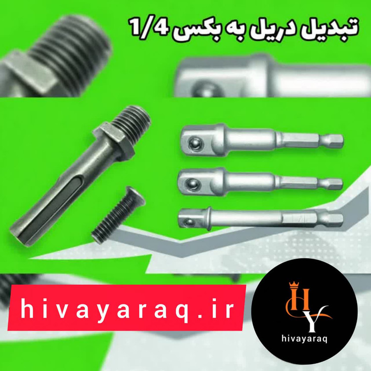 خب، چون واقعیت اینه که دریل/پیچگوشتی معمولی اصلاً بکس واقعی نمیسازه (در واقع این ابزارها برای ضربهکاری و گشتاور بالا طراحی نشدن)، چیزی که واقعاً میگیری آداپتور یا رابط «hex to square» هست که خروجی دریل رو به درایو چهارگوش (Socket Drive) سایز 1/4 اینچ تبدیل کنه تا بتونی سوکتهای بکس کوچک رو ببندی و باز کنی. این قطعه معجزه نمیکنه ولی کارتو با ابزارت راحتتر میکنه.